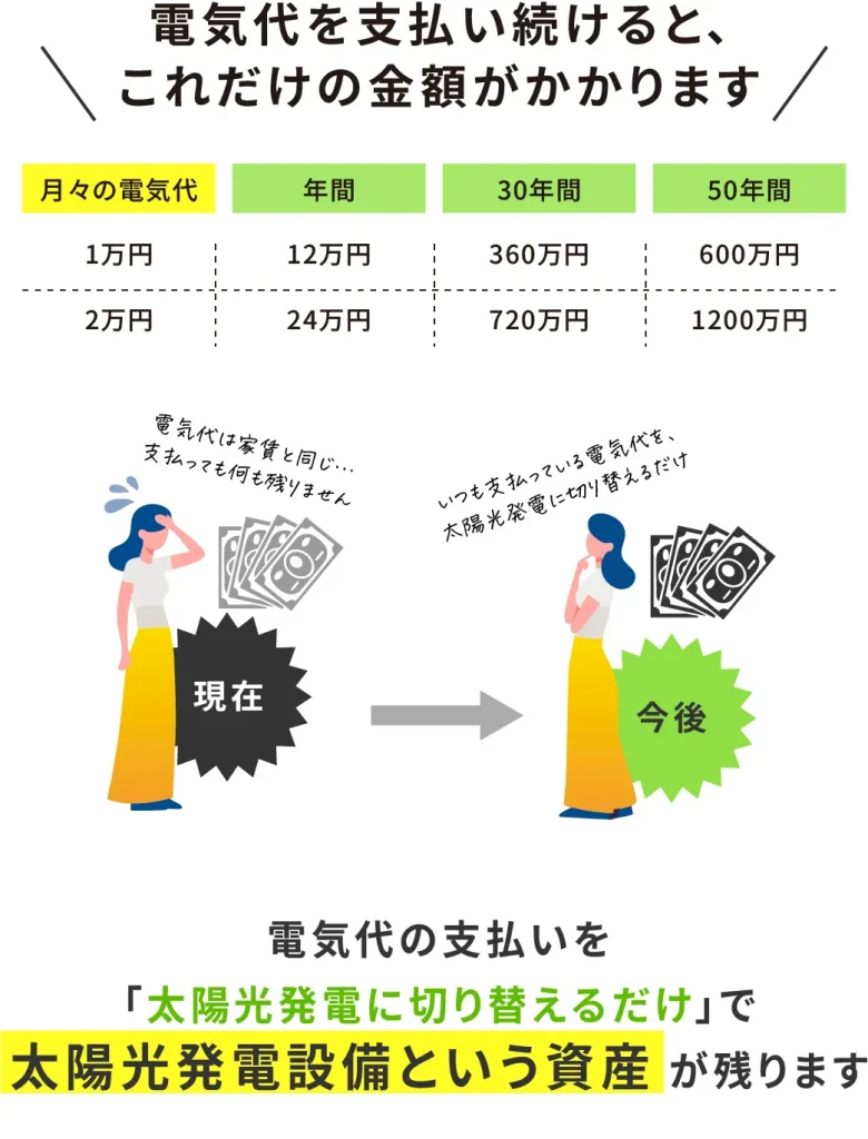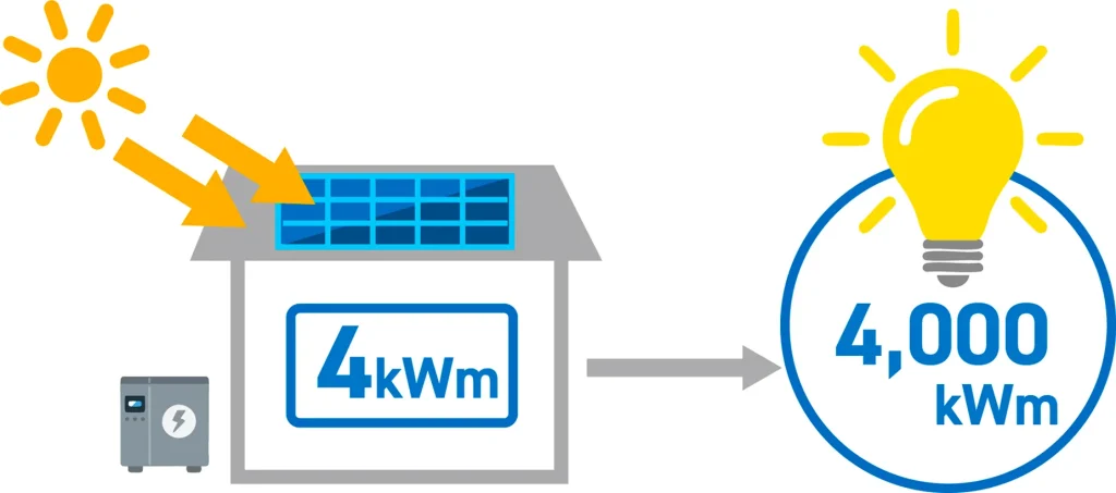 屋根の角度や、設置の方位によりますが、太陽光発電のシステム搭載容量1kWあたりで発電される電気は約1,000kWhです。 4kWシステム搭載容量の場合は、4,000kWh発電します。