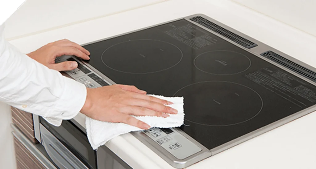 IHクッキングヒーターはフラットな形状なので、汚れをサッとふき取ることができ、お掃除がとっても簡単です。上昇気流が少ない為、油などの飛び散りを抑えることができ、換気扇や壁のベタベタを抑えることもできます。