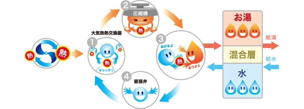 ①冷媒二酸化炭素(CO2)を用いる。ファンを回転させ外気をヒートポンプ内に取り込み、ユニット内のCO2を暖める。ここではより高温の外気から熱交換器を介してよ