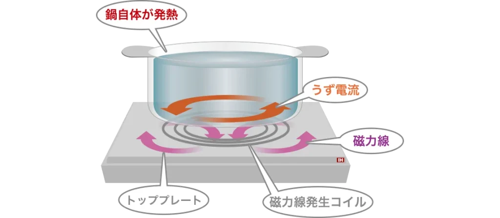 IHクッキングヒーターは、磁力発生用コイルにより発生した磁力線が、金属製の鍋を通るとき、鍋底にうず電流が生じます。 このうず電流が鍋そのものを発熱させます。